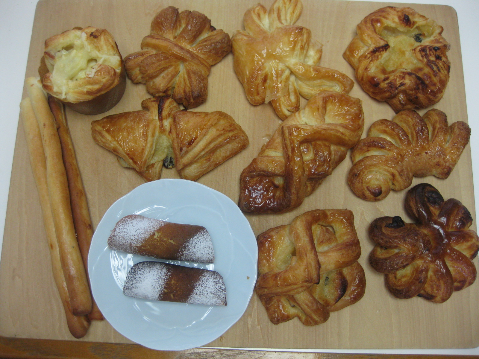 1月4日 講師クラス 2014年1月4日 | admin ボレリーア (スペインの発酵菓子。デニッシュペストリーと同じように60%のバターを折り込んでます。アーモンドフィリングを使用して色んな形を作ります。) ビア・シュタンゲル (ドイツのスチックタイプの菓子パン) お楽しみメニュー 小鼓 (もち粉を使用してます)