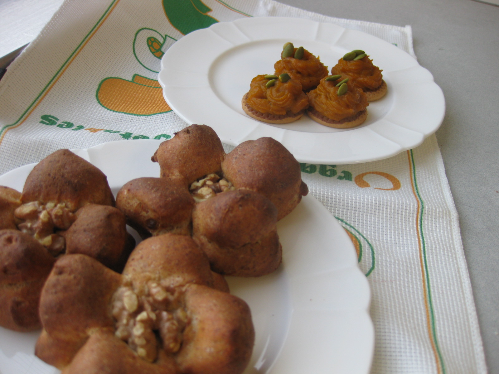 10月24日 済生会フィットネス&カルチャークラブ 2015年10月24日 | admin ☆手作りパンとお手軽クッキング チーズジャーム(写真手前) ジャーム=胚芽。胚芽15%・プロセスチーズ50%入りの食卓パンです。成型はクルミをイメージしてます。 スイートパンプキン かぼちゃはレンジで火を入れ、砂糖・卵を混ぜ、ビスケットの上に絞り出して200℃5分程焼いてます。