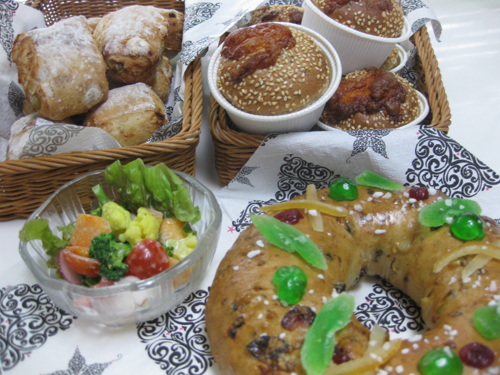11月26日 フレンズ 2015年11月26日 | admin ☆おしゃべりルーム今日のメニュー ・エピファニースイートグッツ(写真右手前) ・セサミドーム(写真右上) ・豆パン(写真左上) ・サラダ ブロッコリー・カリフラワー(カレー粉で黄色に)・トマト・サニーレタス・柿・ラディッシュ ビオレブルーベリーとマスカルポーネ入りのムース