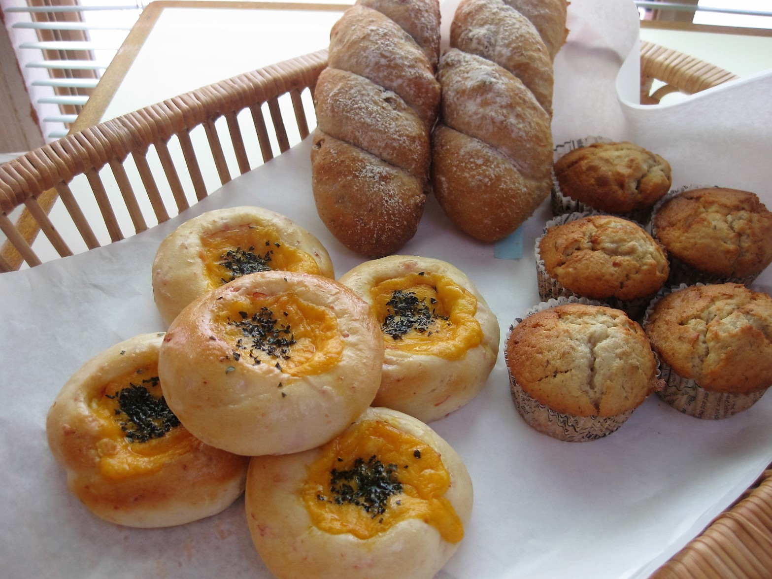 10月25日 お楽しみクラス 2016年10月25日 | admin ・新メニュー そこわ(写真左手前)中心にさいの目チーズ、マヨネーズ、ベーコン、レットチェダーチーズ、バジルが乗ってます。 PAW(写真奥) ピスタチオ、アニスシード、ウオールナッツが混ぜ込まれてます。 ・お楽しみメニュー バナナケーキ