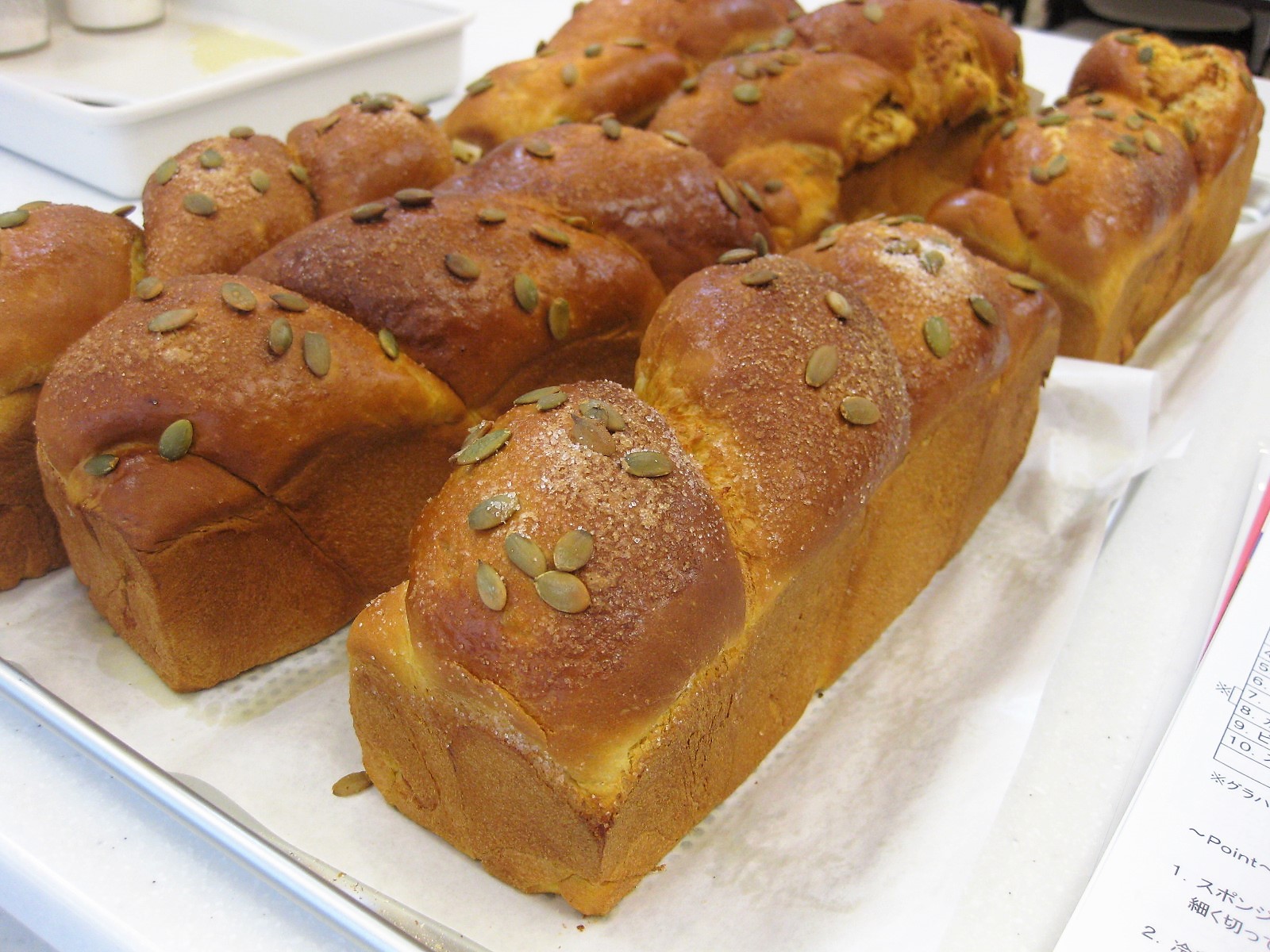 11月19日 大阪本校セミナー(師範クラス) 2016年11月19日 | admin ・教師見直しメニュー パンムニエ 粉ひき職人に敬意を示して作られたパンです。本日はJHBSが開発した電気オーブンで焼成しました。 パーネクアドラート 四角パンの意味。2014年の新メニューです。 ・新メニュー ツイストかぼちゃ パンプキンペースト入りの生地にかぼちゃフィリングを塗ってツイスト成型です。 ・お楽しみメニュー くり饅頭